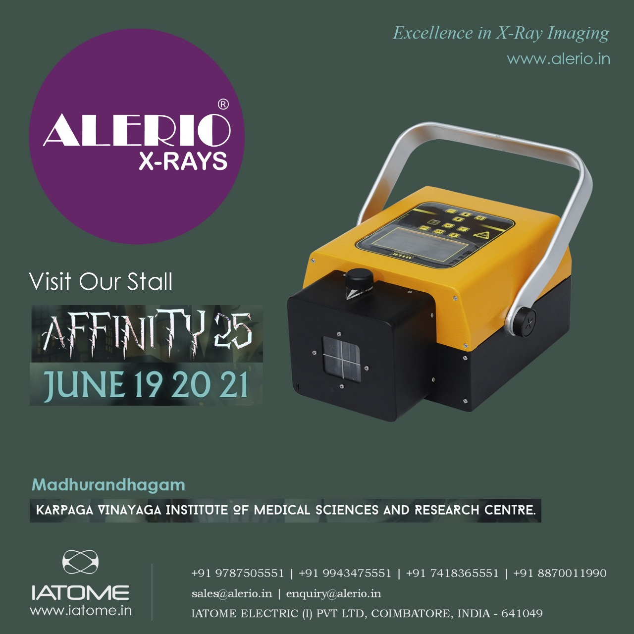 Affinity 2025 June 18, 2025 Alerio X-Rays Inviting Medicos of Tamil Nadu to visit our stall at AFFINITY 2025 from June 19 to 21 at KARPAGA VINAYAGA INSTUTE OF MEDICAL SCIENCES AND RESEARCH CENTRE Madhurandhagam. Excellence in X-Ray Imaging WWW.alerio.in alerio Related postsSeptember 26, 2025KEDDA Dental Expo 2025Read moreSeptember 25, 2025XXXVII GIMACON 2025Read moreSeptember 17, 2025CEZCON Siliguri 2025Read more
